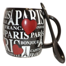 Plongez dans l'ambiance parisienne avec notre Mug Paris cœur ! En format ovale, noir et blanc, ce mug de 200 ml est accompagné d'une cuillère et arbore fièrement les inscriptions "Paris" et "France", soulignées par des cœurs rouges.